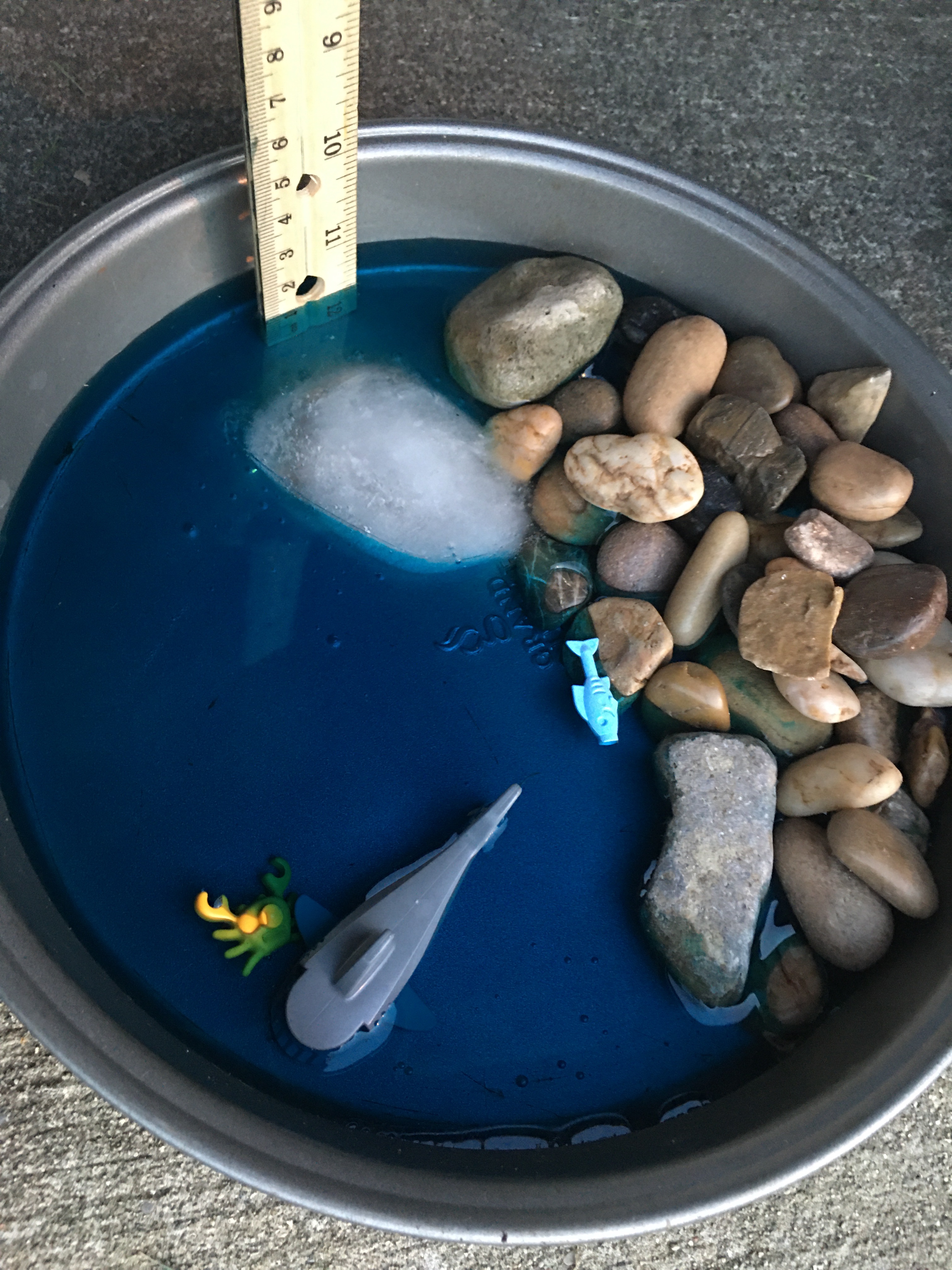 • Leave the dish for around an hour and measure the water level again. There is an increase in the level of water which demonstrates how melting of ice owing to the global warming is causing the sea level to rise.