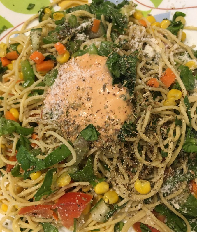 Cook spaghetti as per instructions. In a plate, add chopped spinach, bell pepper, tomatoes, corns, spaghetti and season it with olive oil, Italian seasoning (oregano, thyme, parsley), parmesan cheese, salad dressing ( I used Kraft Thousand Island) lemon juice, salt, black pepper.