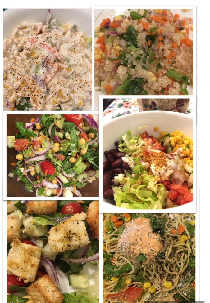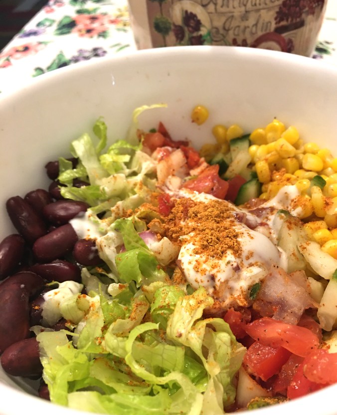In a bowl take cooked (or canned) beans, greens (lettuce, cucumber, bellpepper, avocados, cabbage), corns, tomato onion salsa and season with myonnaise, ranch seasoning mix, taco seasoning, lemon and salt.