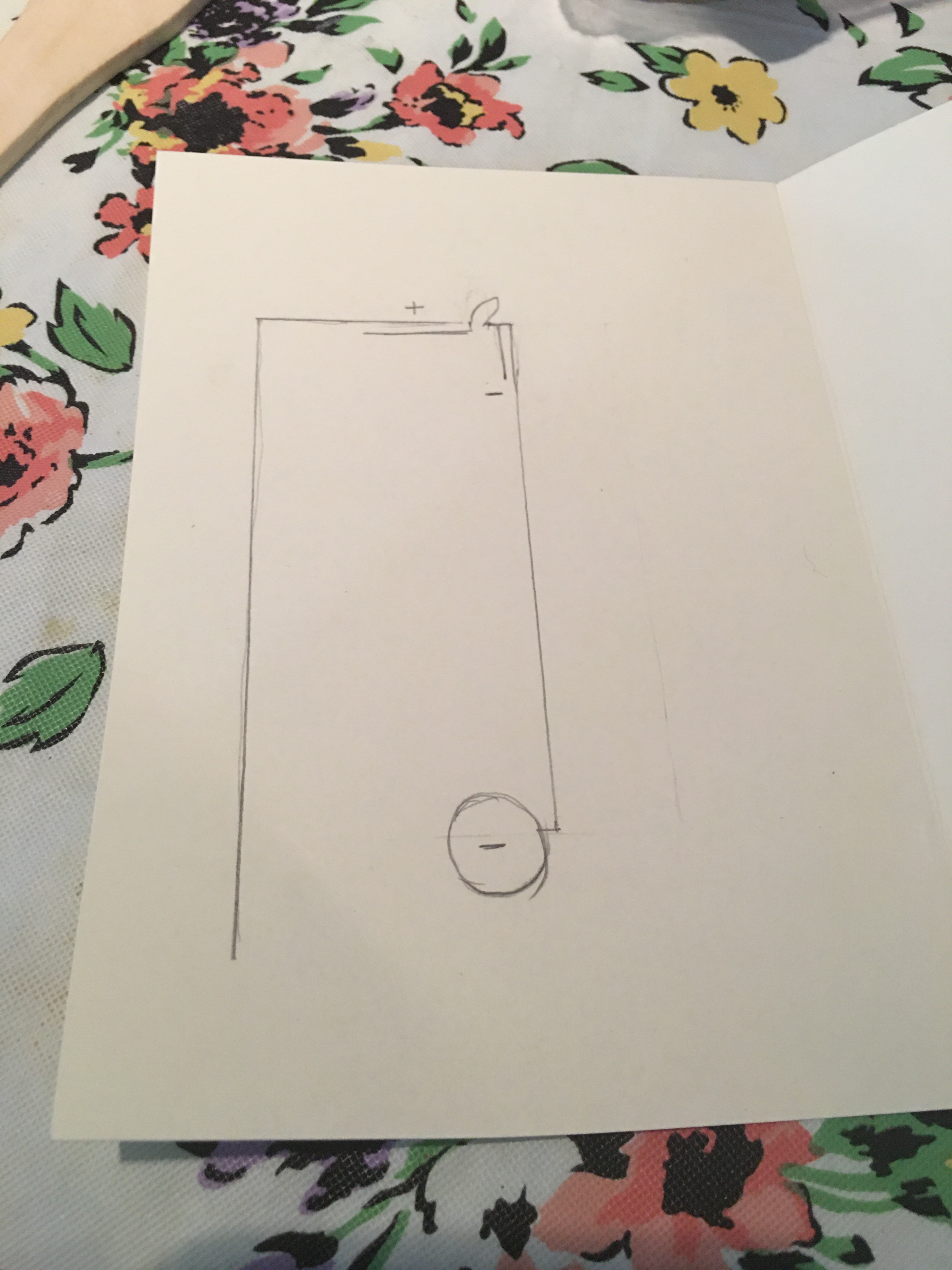 Inside the card, sketch the circuit, deciding the positioning of the battery. Draw two parallel lines for the copper tape/wire starting at the LED locations – one should end under the battery and the other should be about 3/4″ to one side of the battery.