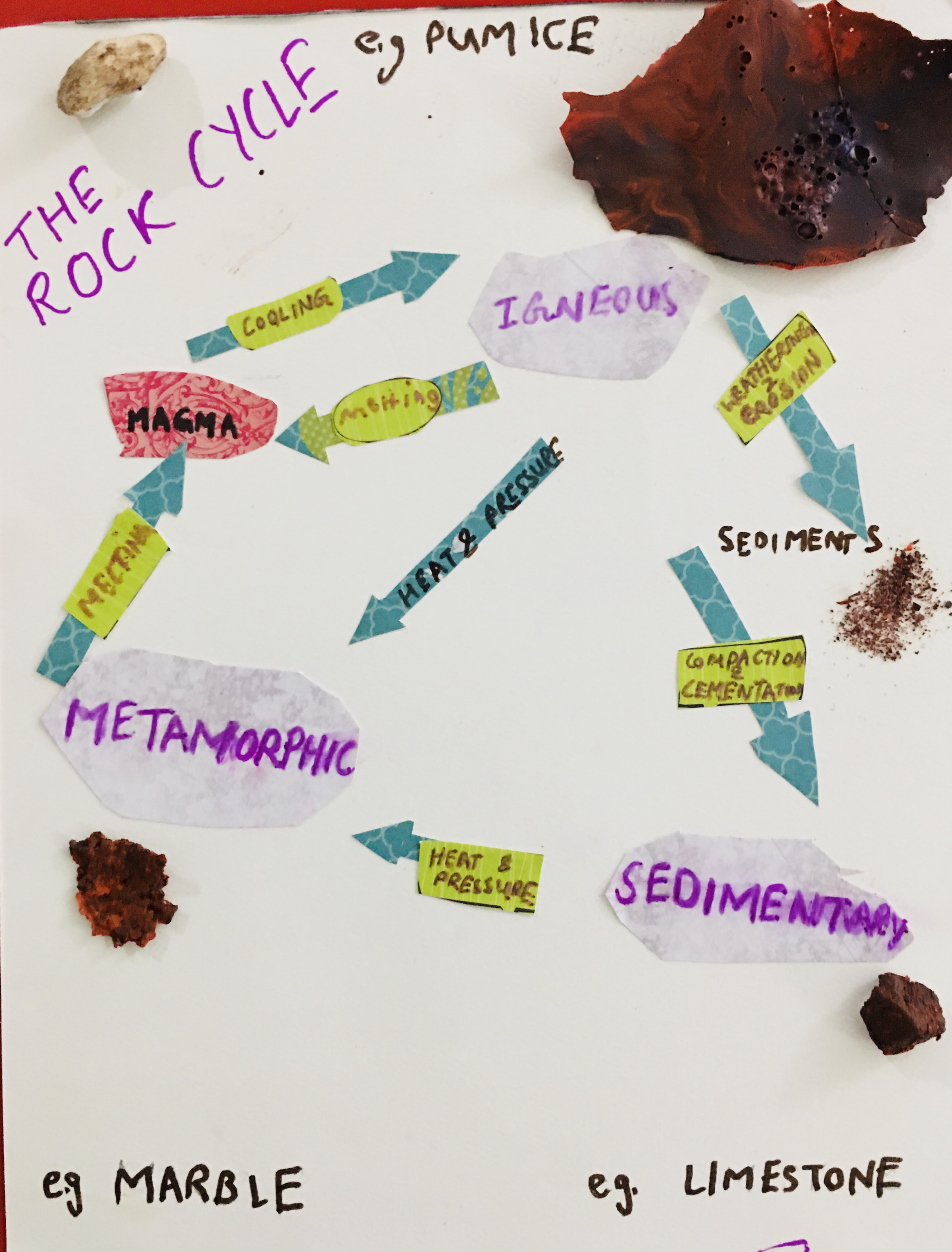 Take an art paper or cardboard to make a diagram of rock cycle. You can be as crafty as possible. Even better, if more of cutting and pasting is done so that it interestingly involves the kids.