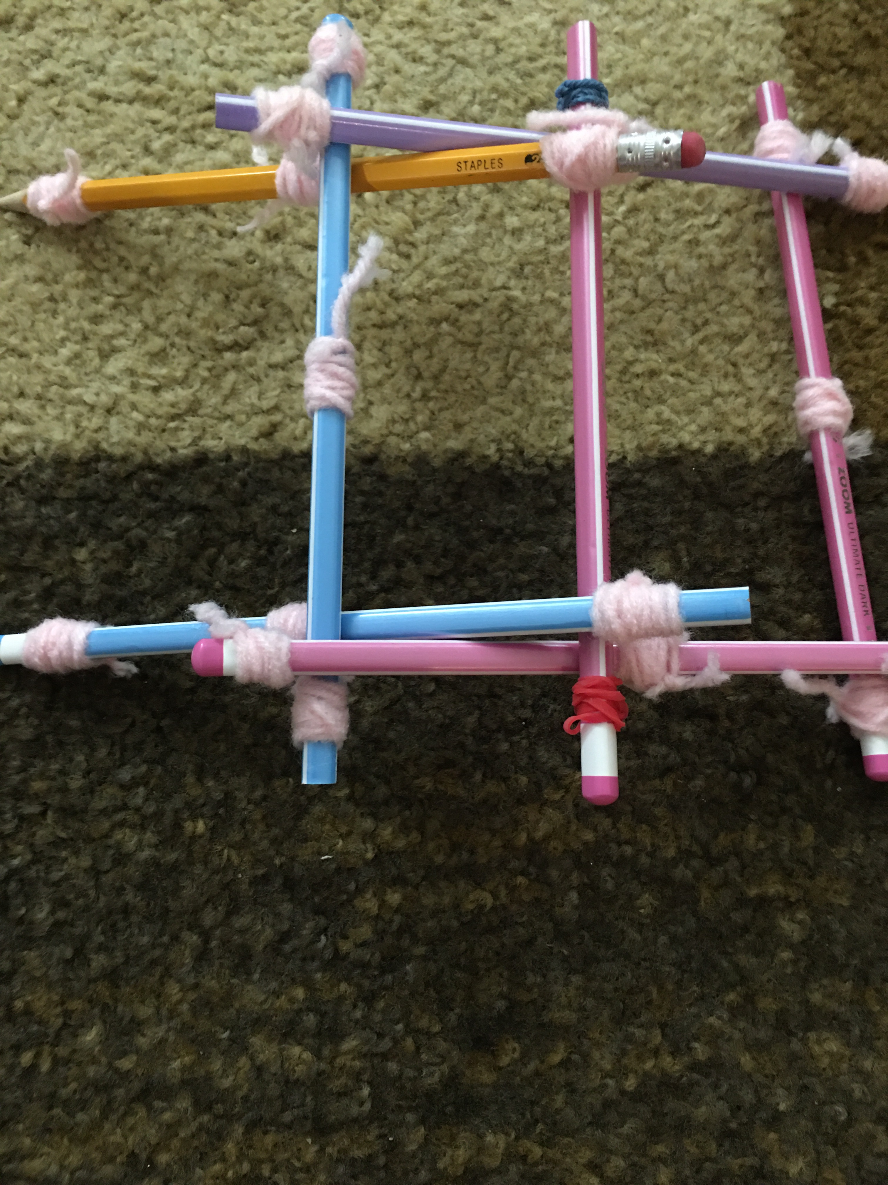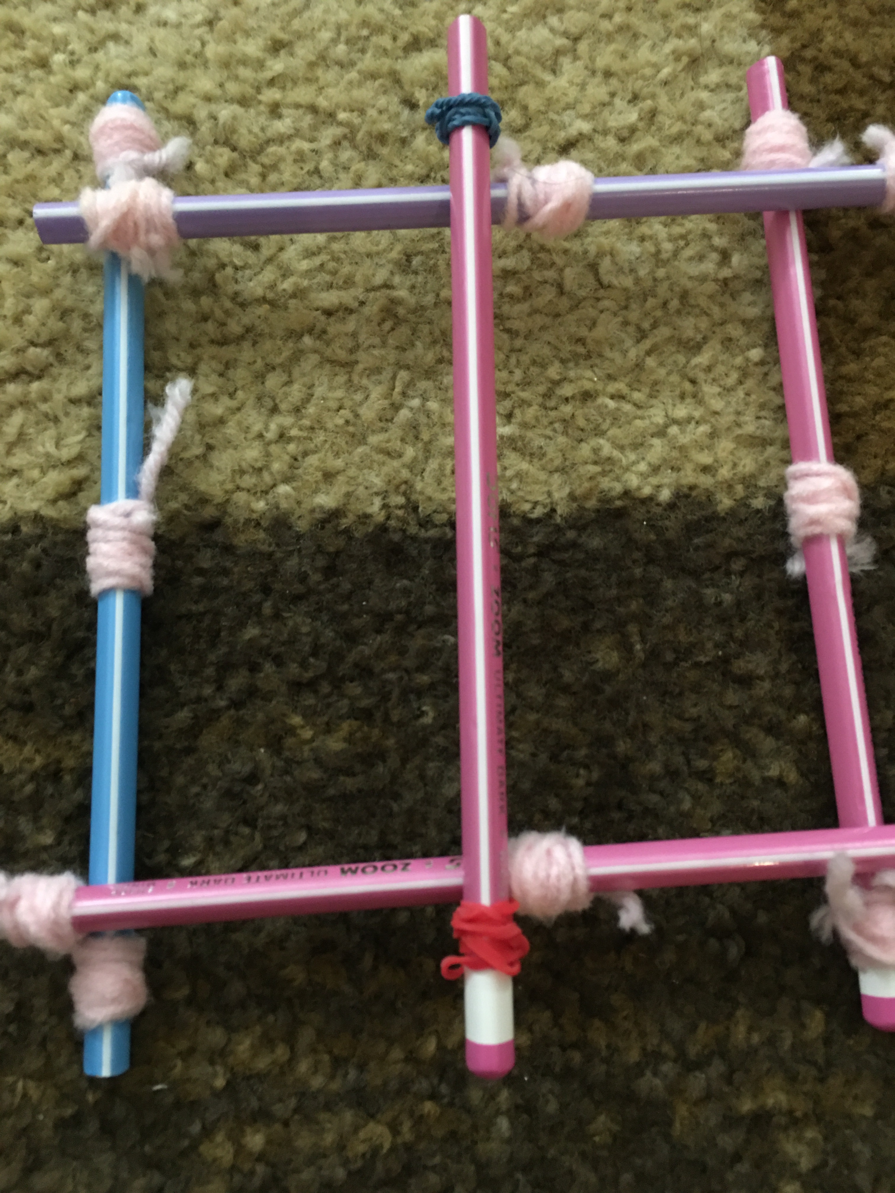 Place two pencils vertically and two horizontally above it so that they are secured by the strings on both the ends.